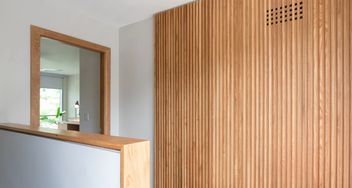 To open up the space, we partially removed the hallway wall, allowing the corridor to visually connect with the bedroom and improve natural light flow. The existing hallway door was removed and replaced with custom slatted hidden doors, maintaining privacy while blending seamlessly into the wall as an architectural feature.